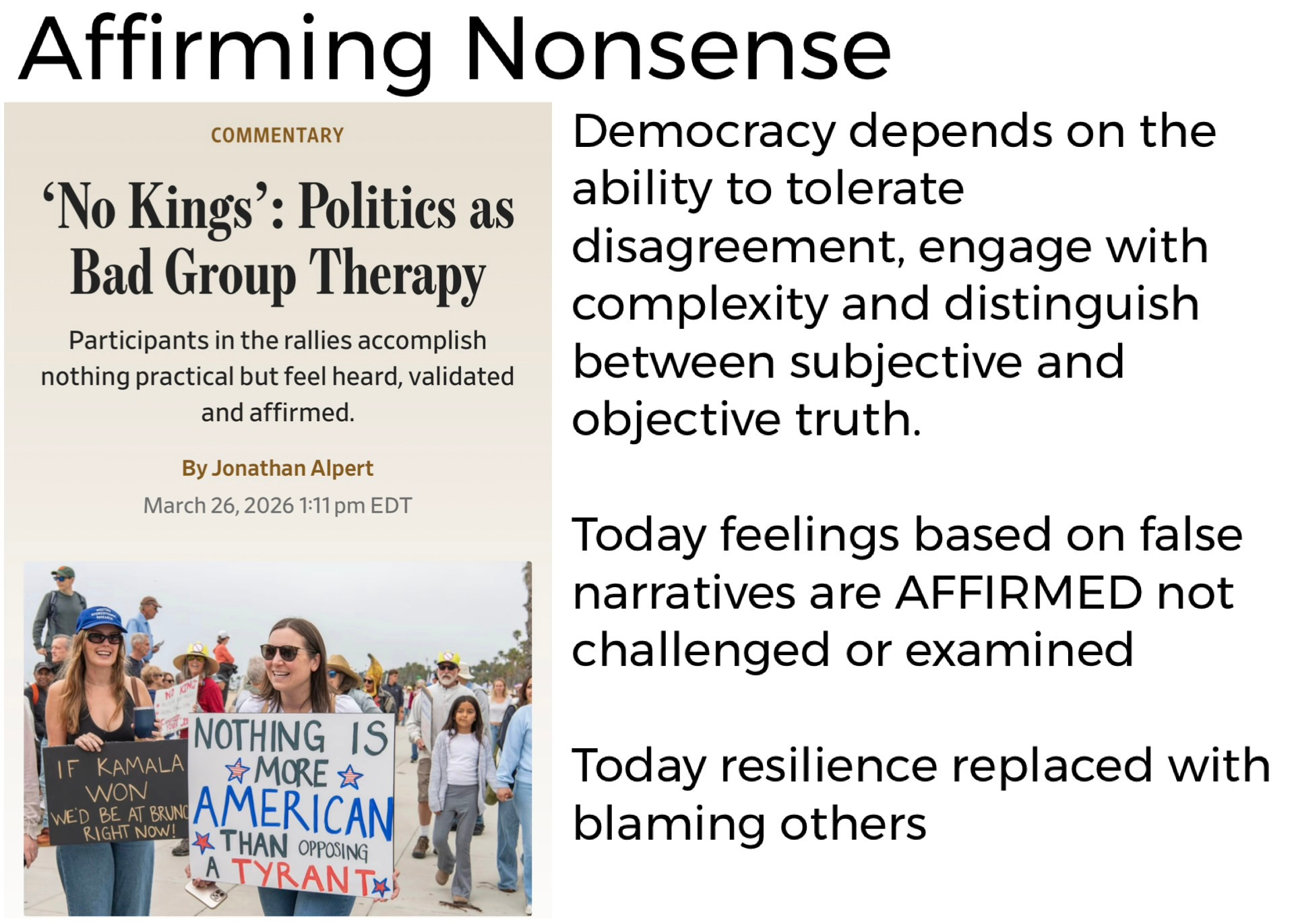 American Snowflakes Bob GonzalezMar 27, 2026ShareA great article https://www.wsj.com/opinion/no-kings-politics-as-bad-group-therapy-df3778ff?st=KwHjwi&reflink=article_copyURL_shareSubscribePrevious