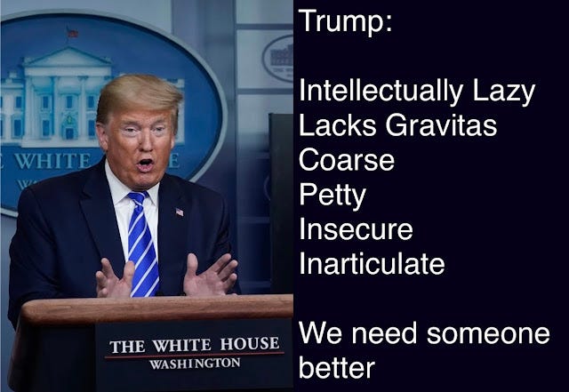 While there were several important accomplishments under Trump (SCOTUS judges, lower taxes, javelins for Ukraine, WARP speed), he is intellectually lazy, lacks gravitas, is coarse, petty, insecure, bombastic, inarticulate, and, as a result, can’t beat a Democrat and is therefore bad for Republicans.