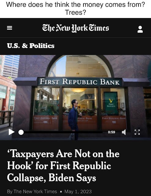 The US government will be providing funds in either a direct or indirect bailout of First Republic bank. The funds needed eventually come from taxpayers. Why does Biden say taxpayers are not on the hook?