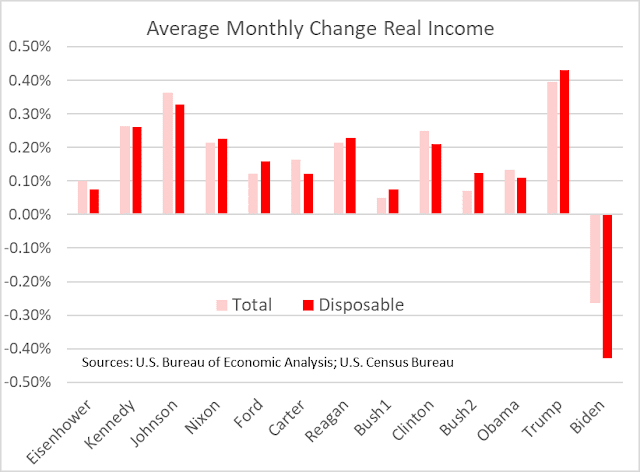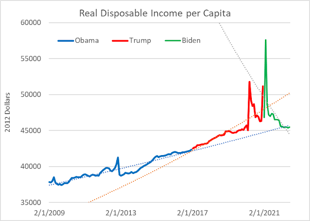 Admittedly some distortion due to pandemic but given Biden's continued use of arbitrary baselines when making comparisons I couldn't help but show the raw data. With inflation raging and economy slowing we are seeing a decline in real incomes, both total and disposable.