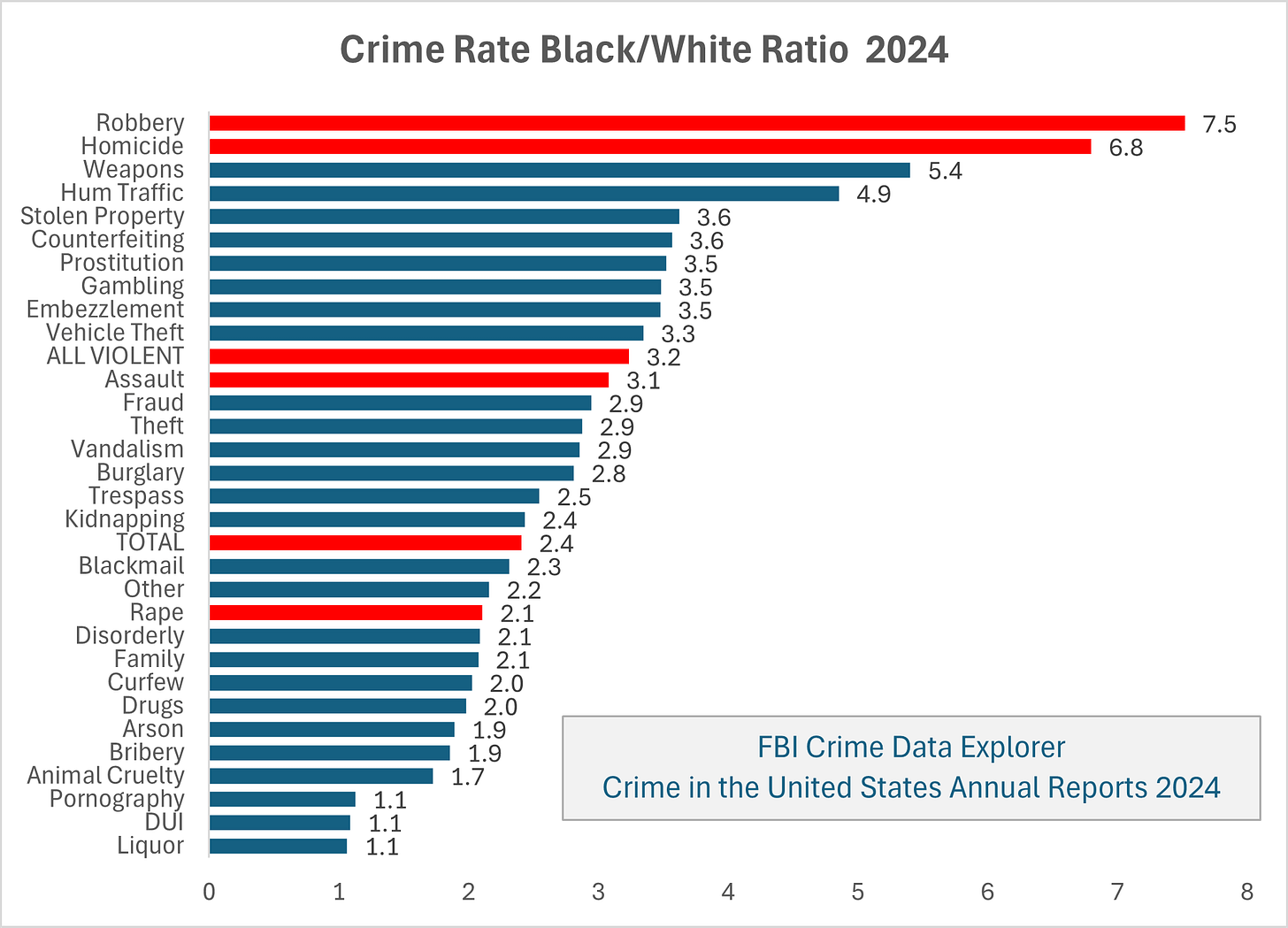 This data shows that blacks commit total crime at a 2.4 times the rate of whites. It shows that blacks commit homicide at 6.8 times the rate of whites. And it shows that blacks commit violent crimes at 3.2 times the rate of whites.