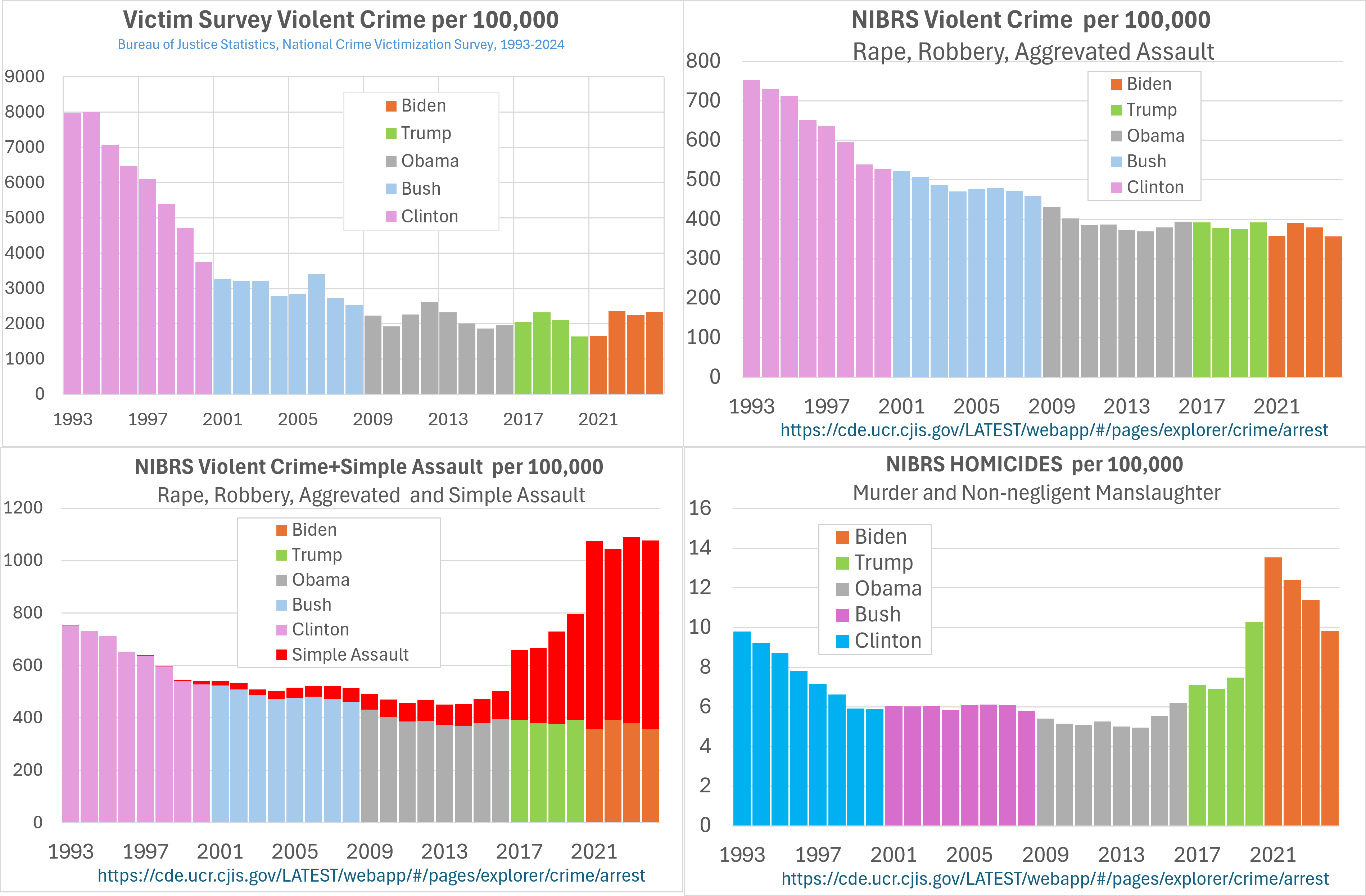 The Victim Survey and the NIBS both indicates that violent crime was essential flat 2021 thru 2024. The Victim Survey shows a much higher count of crime in large part thought to be due to under reporting of crimes and to a lessor degree due to intricacies of the differences between the two methods and the self reporting nature of the victim survey.