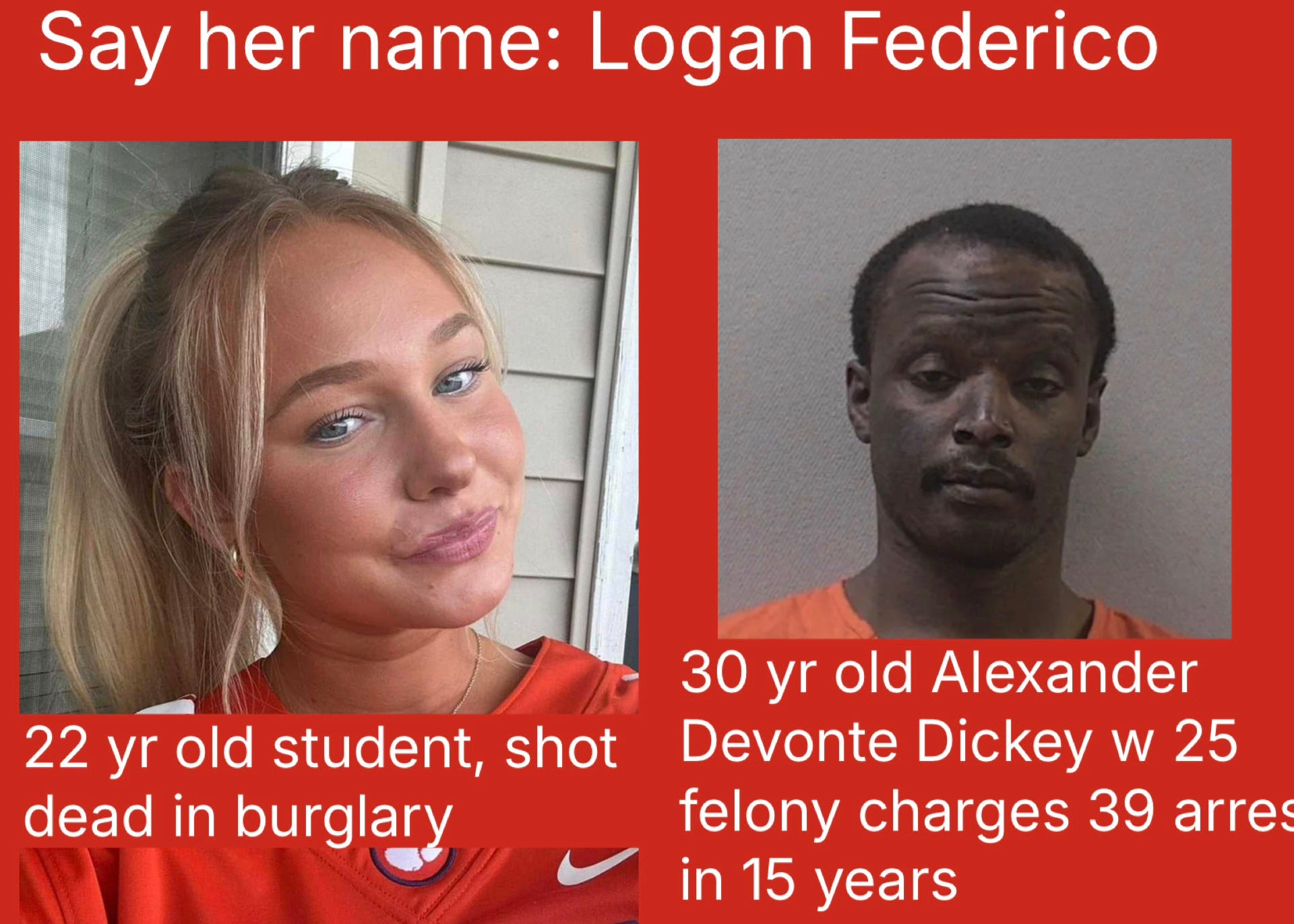 Alexander Devonte Dickey, 30 year old, with 39 arrests and 25 felony charges since he was 15 was free to roam the streets. After breaking into one house and stealing a gun, he broke into the house where Logan was visiting friends, pulled her out of bed and viciously shot her.