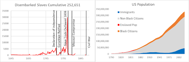 A review of slaves, immigrants and citizens of the United States shows that the actual numbers of slaves brought to the United States (~250,000), the ultimate number of slaves (~4 million), and the number of descendants of slaves compared to the total number of immigrants, and non-black citizens in the United States has always been small percentage of the populations and that the immigrants and non-black citizens were a large majority of the populations and no doubt contributed significantly to building the United States.