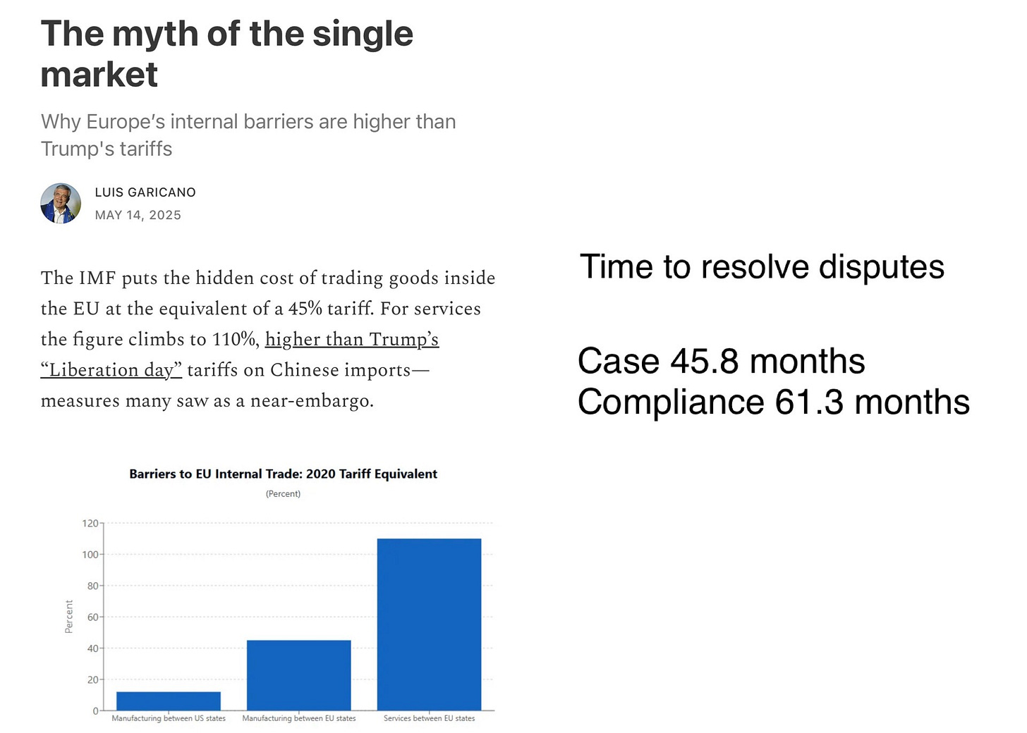 The IMF puts the hidden cost of trading goods inside the EU at the equivalent of a 45% tariff. For services the figure climbs to 110%, higher than Trump’s “Liberation day” tariffs on Chinese imports—measures many saw as a near-embargo…