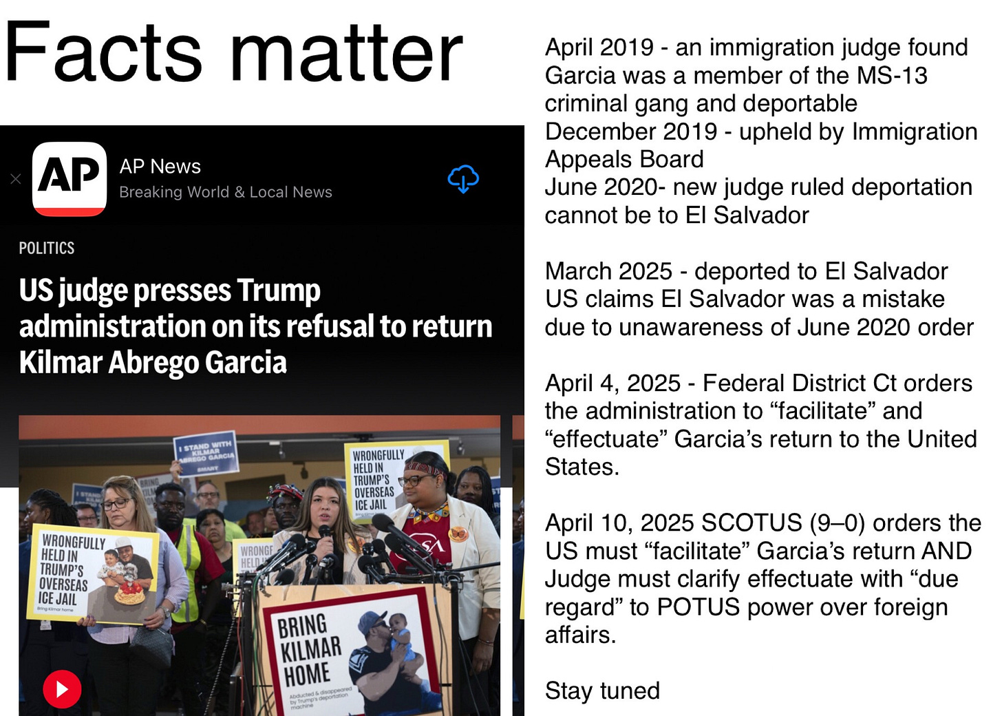 April 10, 2025 SCOTUS (9–0) orders US must “facilitate” Garcia’s return AND Judge must clarify effectuate with “due regard” to POTUS power over foreign affairs.