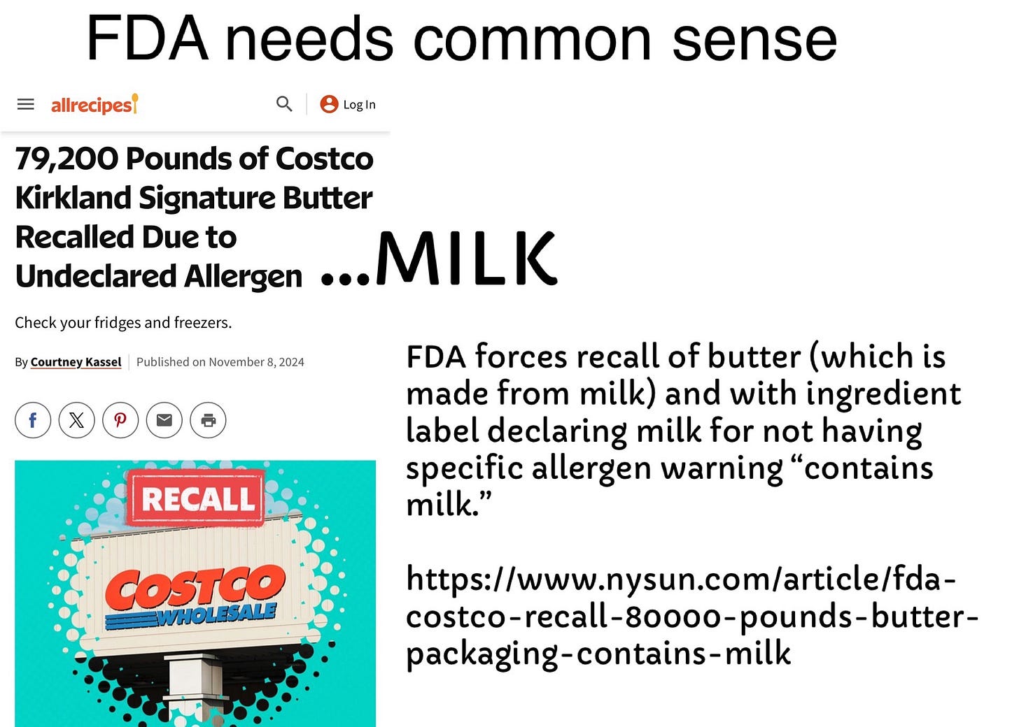 FDA Needs Common SenseBob GonzalezNov 11, 2024ShareFDA forces recall of butter (which is made from milk) and with ingredient label declaring milk for not having specific allergen warning “contains milk.”https://x.com/optimistcskeptc/status/1856121316526419996?s=46&t=Y4fVsDnz2q8uZ3VNKeco4ASubscribePreviousNext