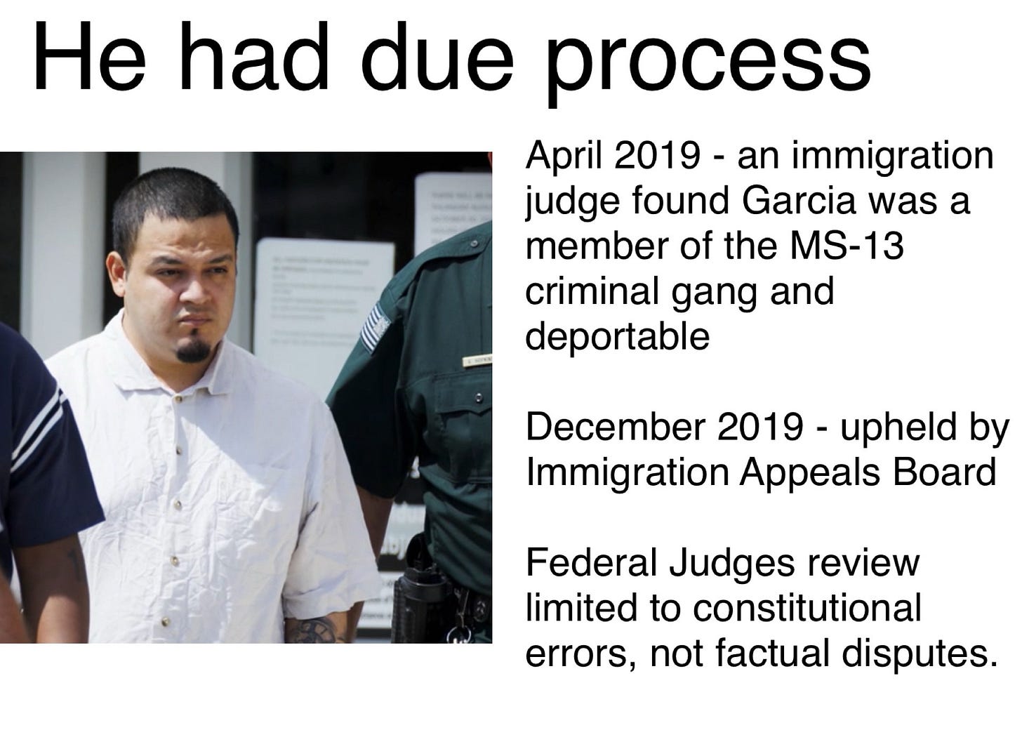 April 2019 - an immigration judge found Garcia was a member of the MS-13 criminal gang and deportable