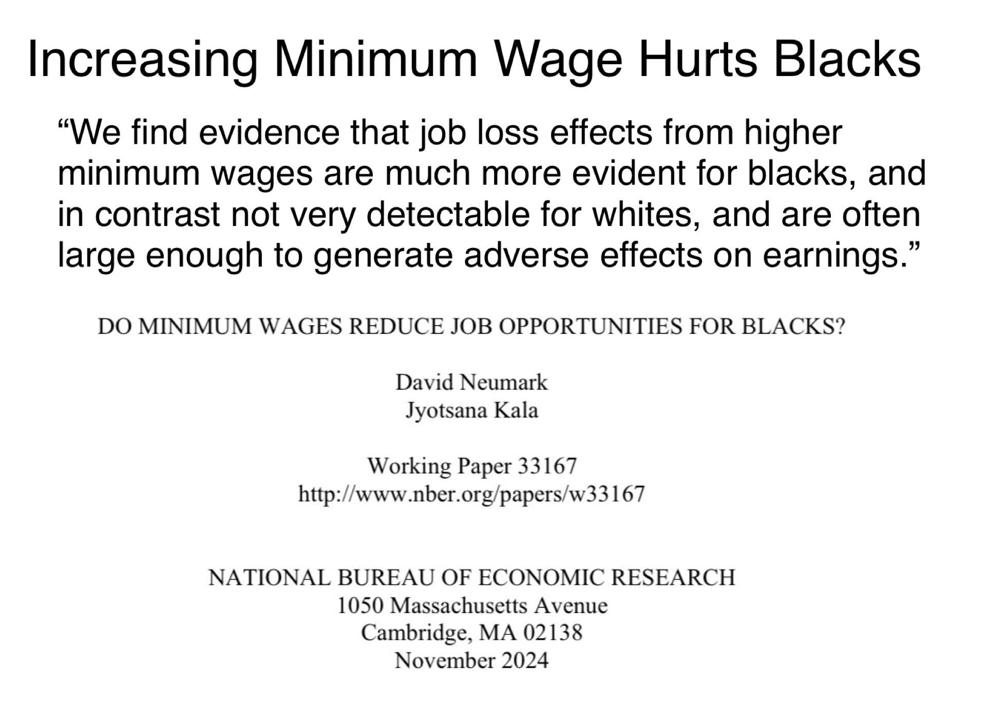 Increasing minimum wage hurts blacksBob GonzalezNov 20, 2024ShareNew paper shows that increasing minimum wage decreases black employment. nber.org/papers/w33167https://x.com/optimistcskeptc/status/1859235712169558349?s=46&t=Y4fVsDnz2q8uZ3VNKeco4ASubscribePreviousNext