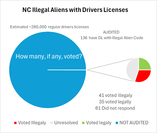 How many, if any, are registered to vote? - In 2014 NC found that of the ~10,000 people with a DL with noncitizen code, 1,425 registered to vote. This would equate to 40,000+ illegal aliens registered to vote.