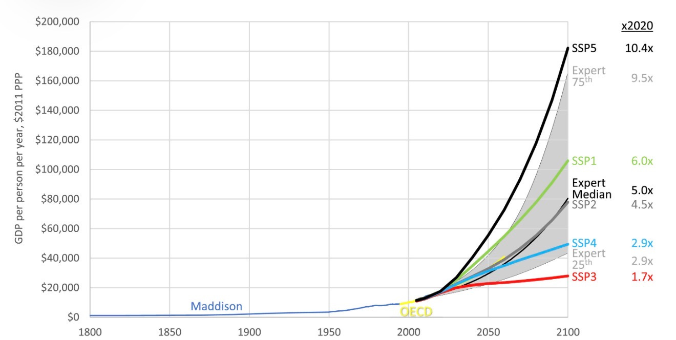 After adjusting for climate damages, SSP5 will on average leave grandchildren of today’s poor $48,000 better off every year. It will reduce poverty by 26 million each year until 2050, inequality will be lower, and more than 80 million premature deaths will be avoided.