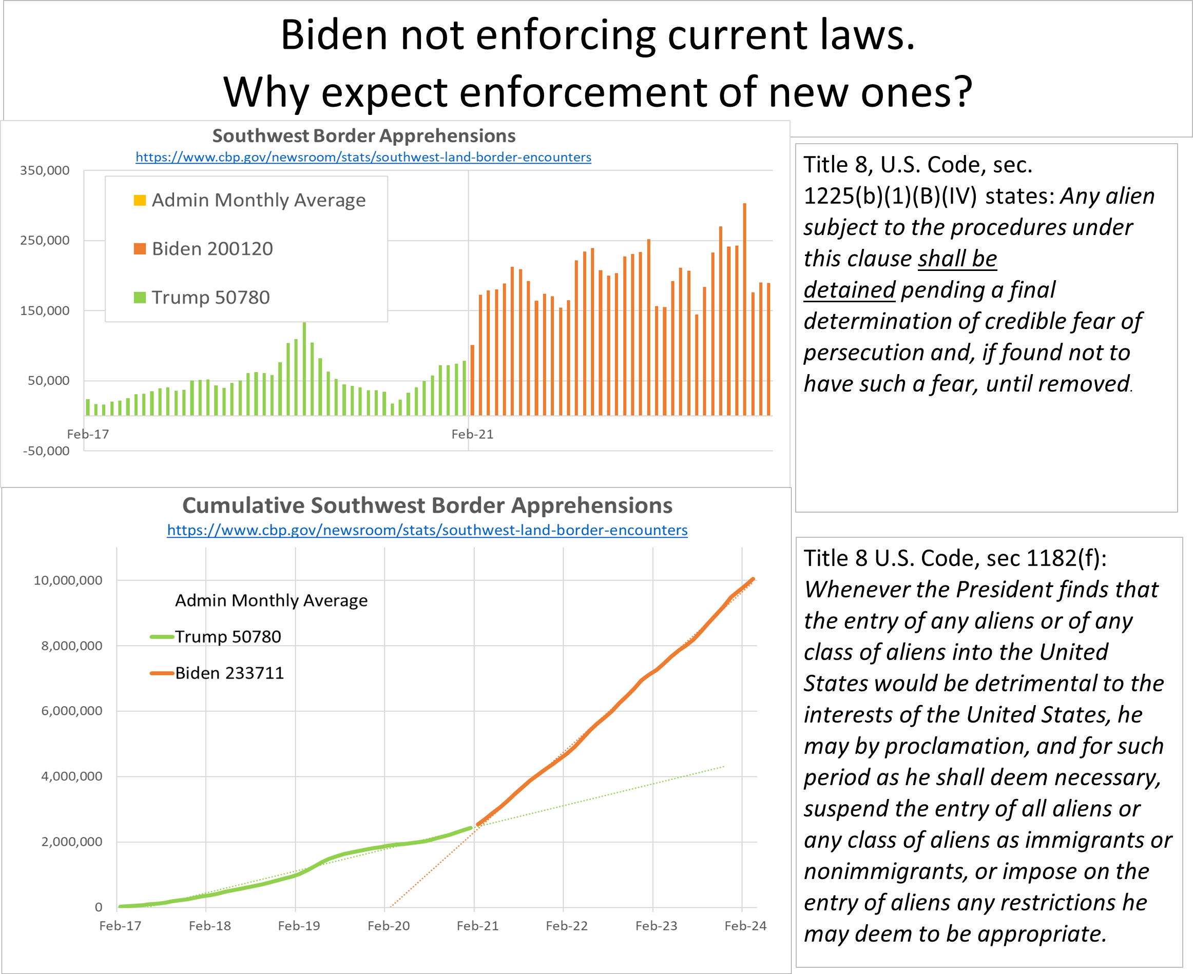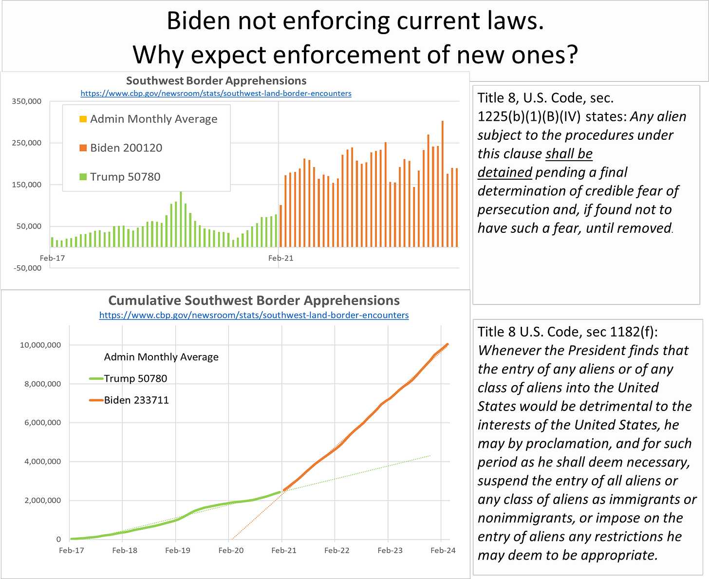 Biden's Illegal Immigration will allow almost 11 MILLION illegal immigrants into the US. And this doesn't count the "got aways," people crossing the border without being caught. Biden is not enforcing the existing laws resulting in a porous border for illegal immigrants. Biden’s border policies continue to be a mess, put many innocents at risk AND allow Mexican cartels to get rich. Why does anybody think he would enforce any new laws.
