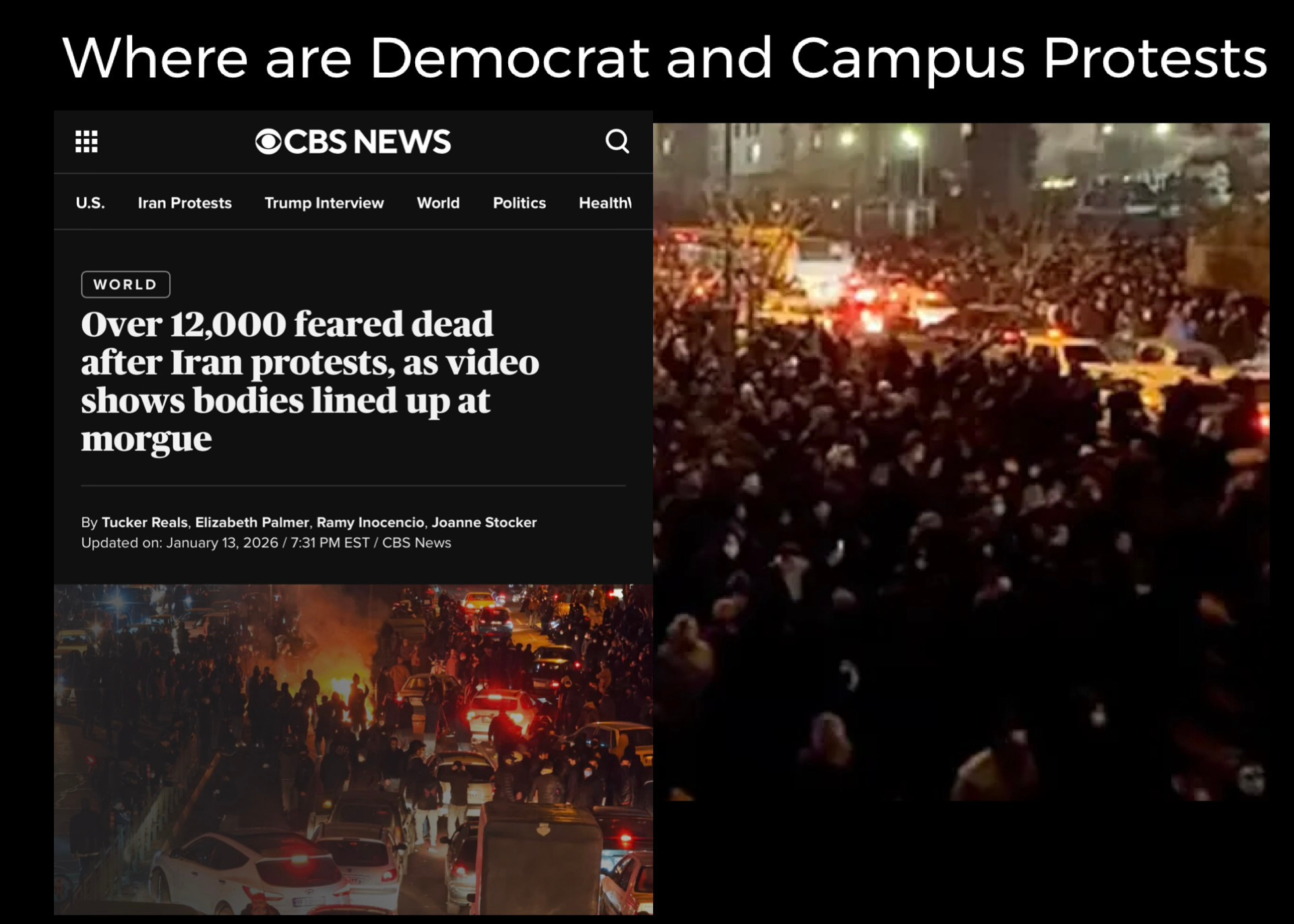 Where are Democrats and US Students Bob GonzalezJan 15, 2026ShareKind of amazing that the Democrats and University students had so much energy and anger supporting Hamas terrorists and there’s BARELY A PEEP supporting the Iranian people rioting against their corrupt evil government. SubscribePreviousNext