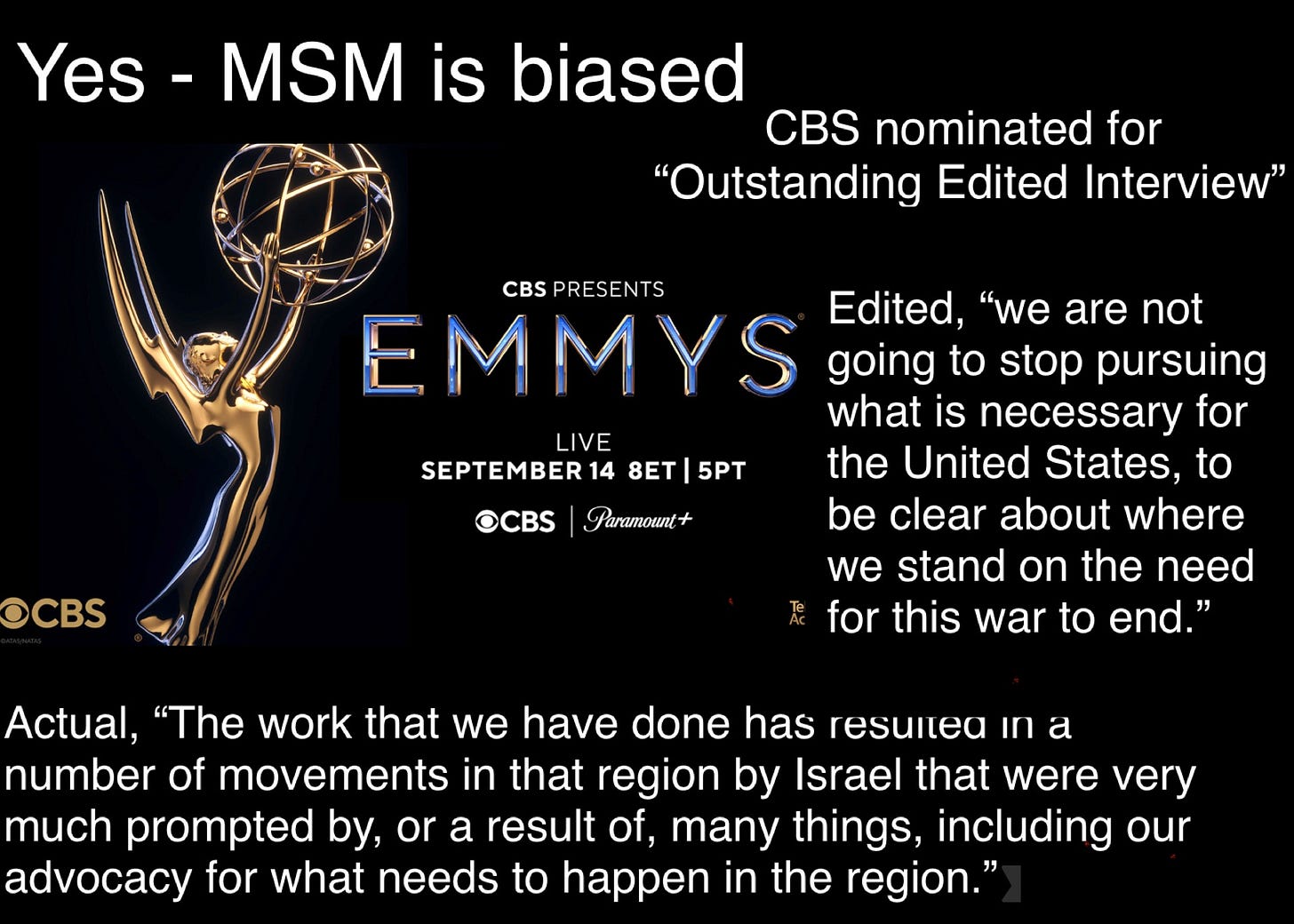 Yes - MSM is biased And so are EmmysBob GonzalezMay 04, 2025Sharehttps://jonathanturley.org/2025/05/04/cbs-nominated-for-emmy-for-the-editing-of-controversial-harris-interview/SubscribePreviousNext